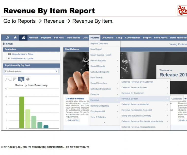 The Revenue by Item Report in NetSuite can be used for revenue recognition reconciliation. It will show you the revenue amounts grouped by item. The balances on this report directly tie to the income statement.